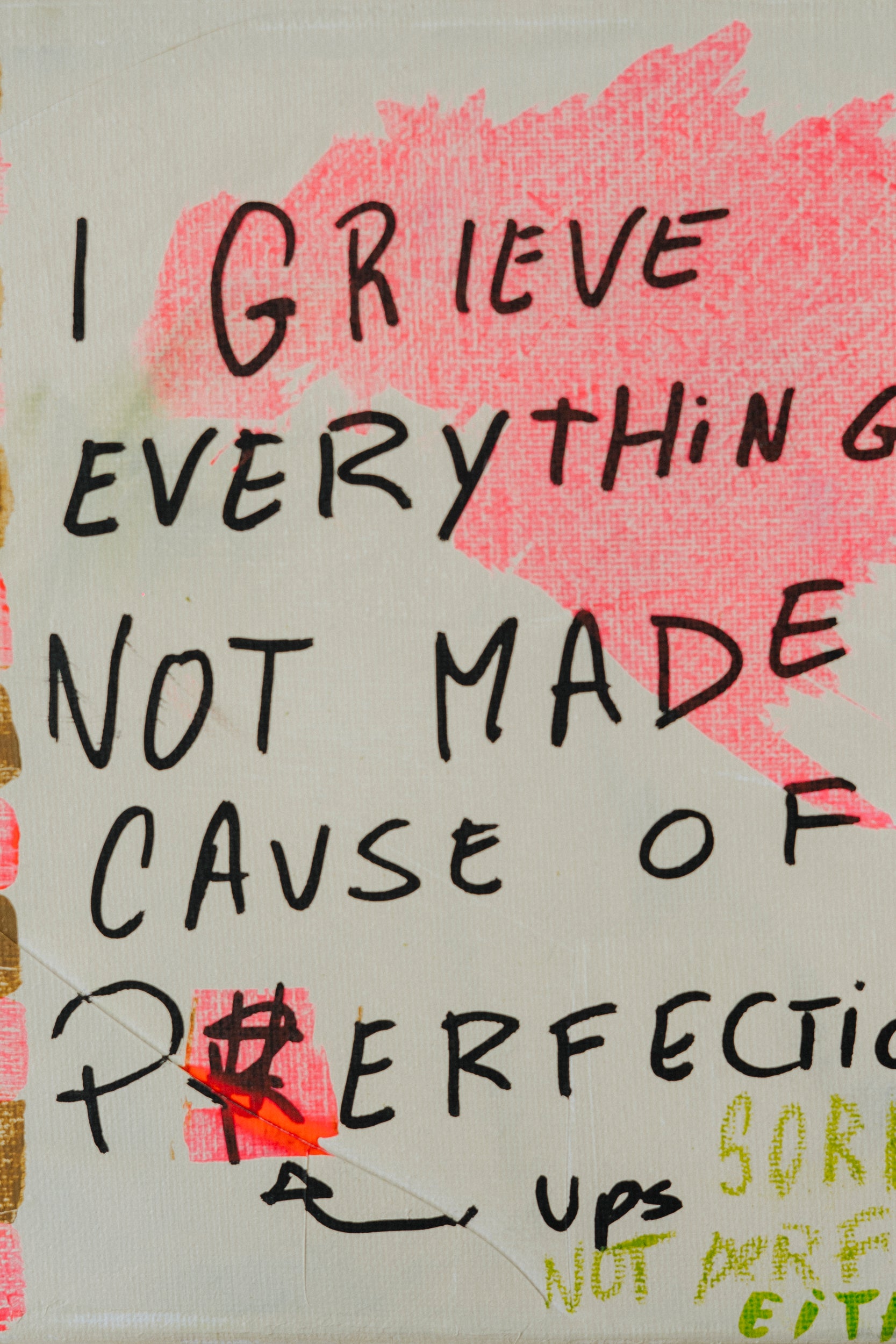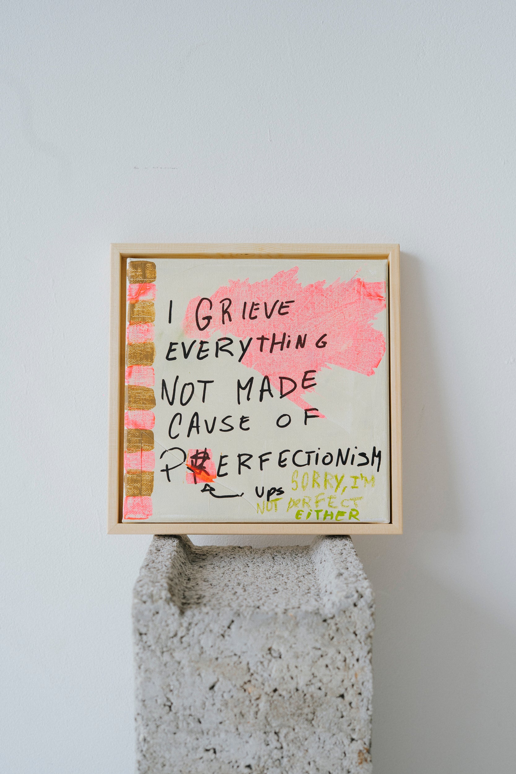 This 20 × 20 cm artwork explores themes of imperfection, emotion and contemporary text-based art.