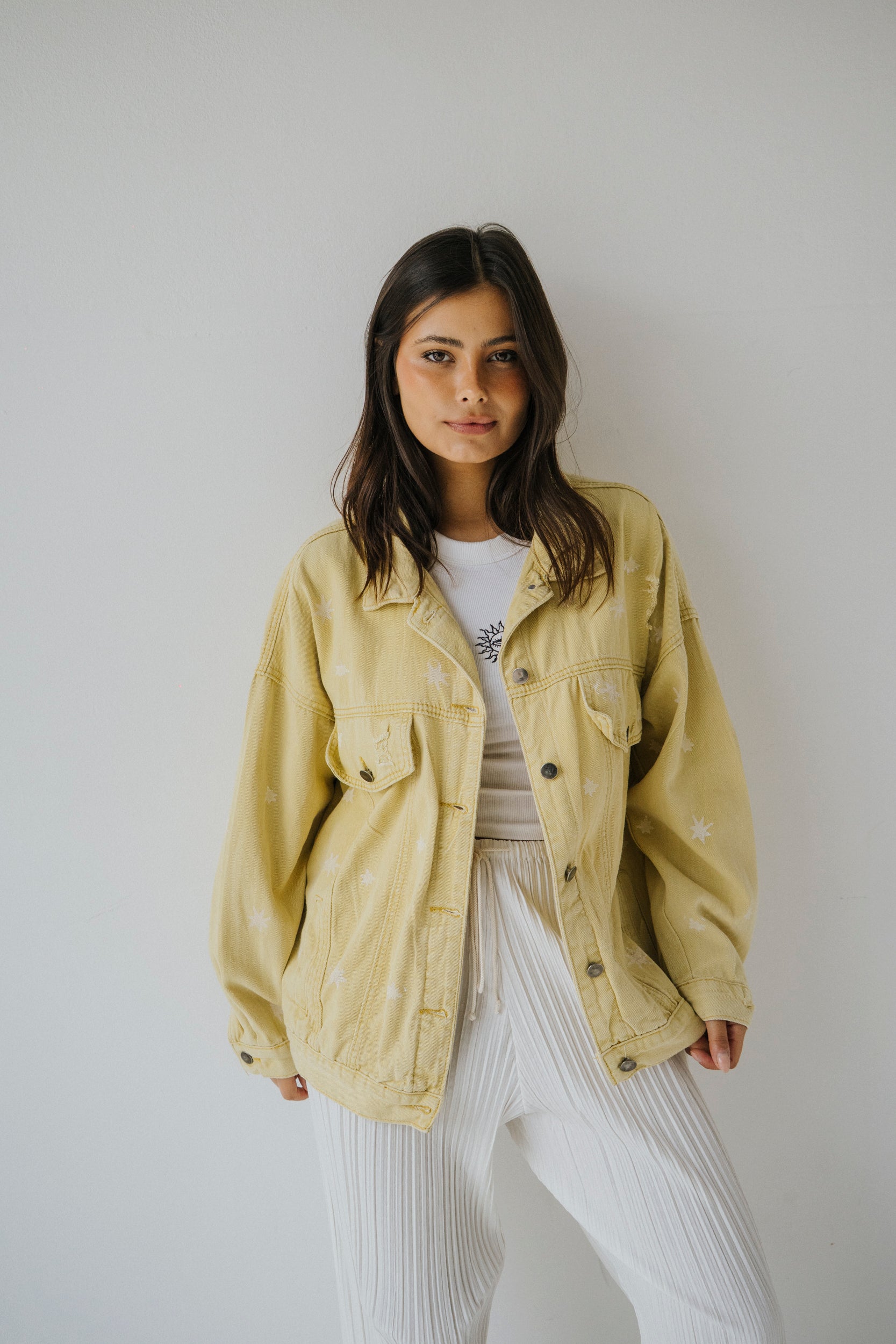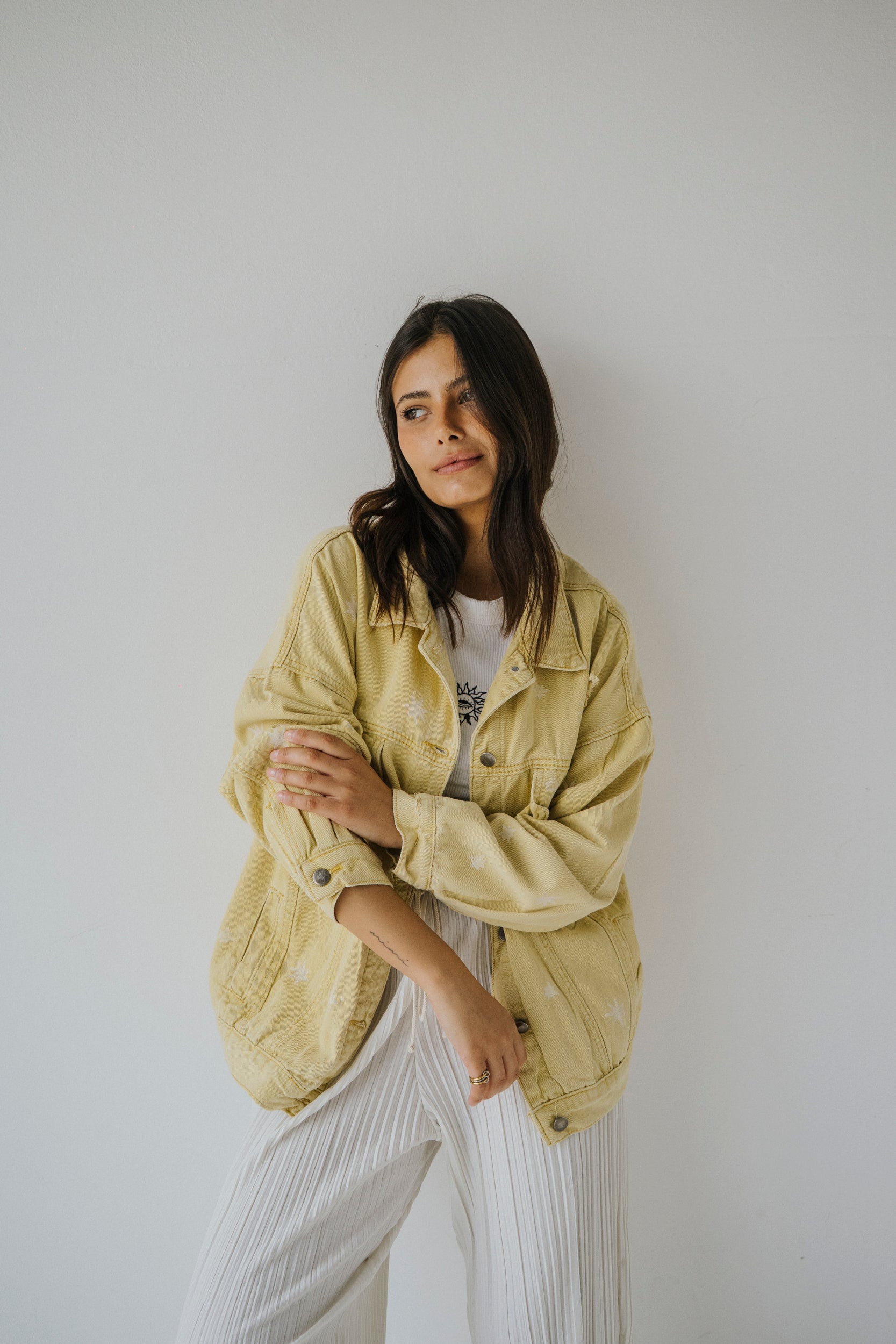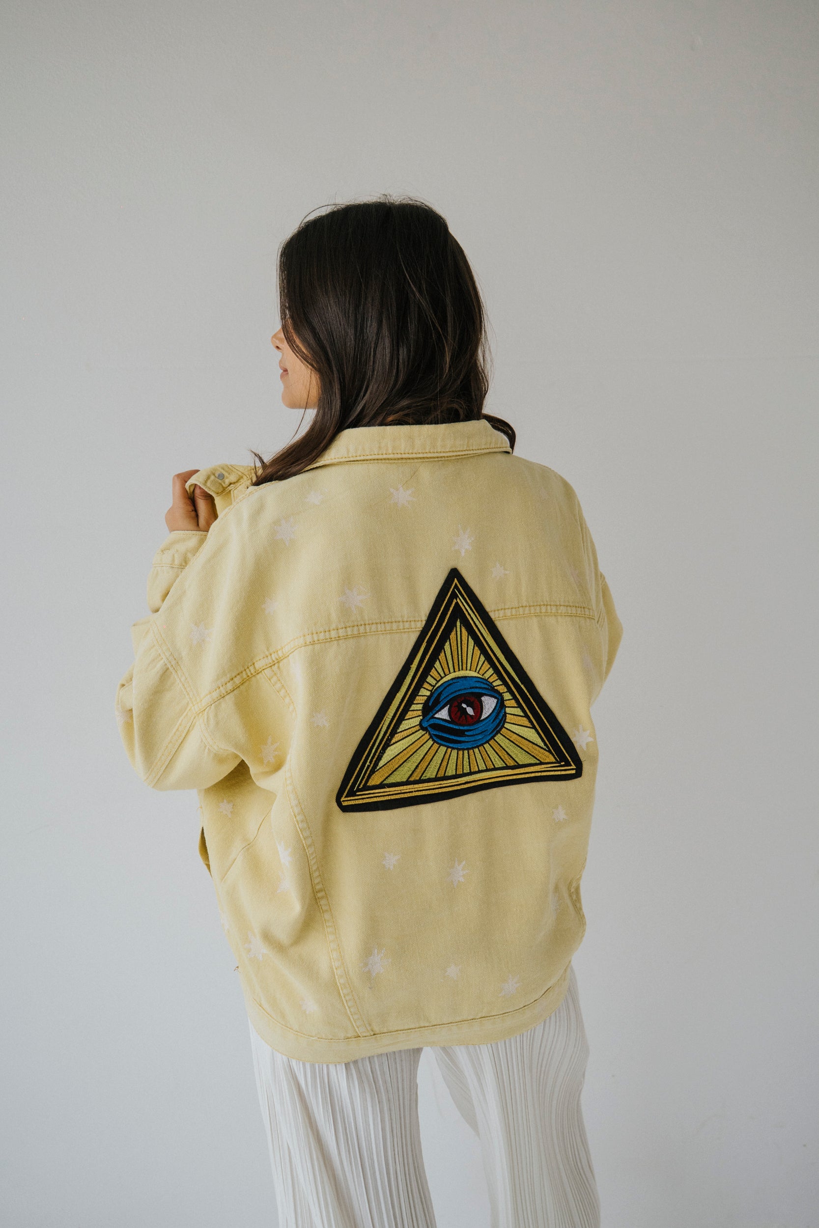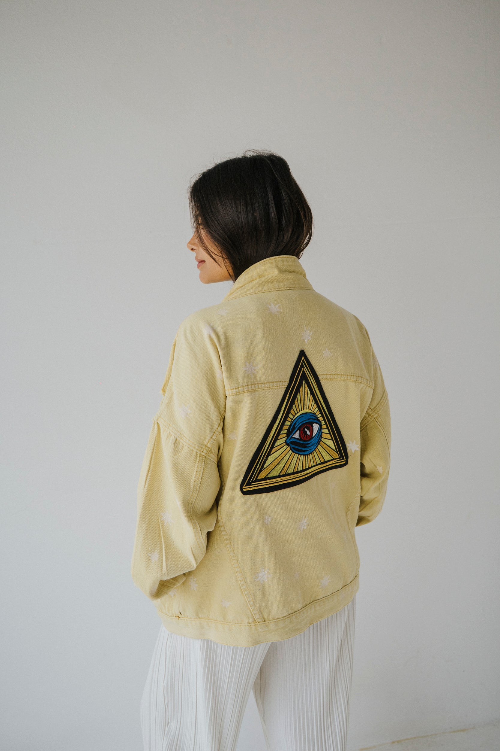 Casaco de ganga recuperado em segunda mão, personalizado à mão com carimbos e um bordado statement nas costas que transforma a peça por completo. Pode conter marcas de tinta.