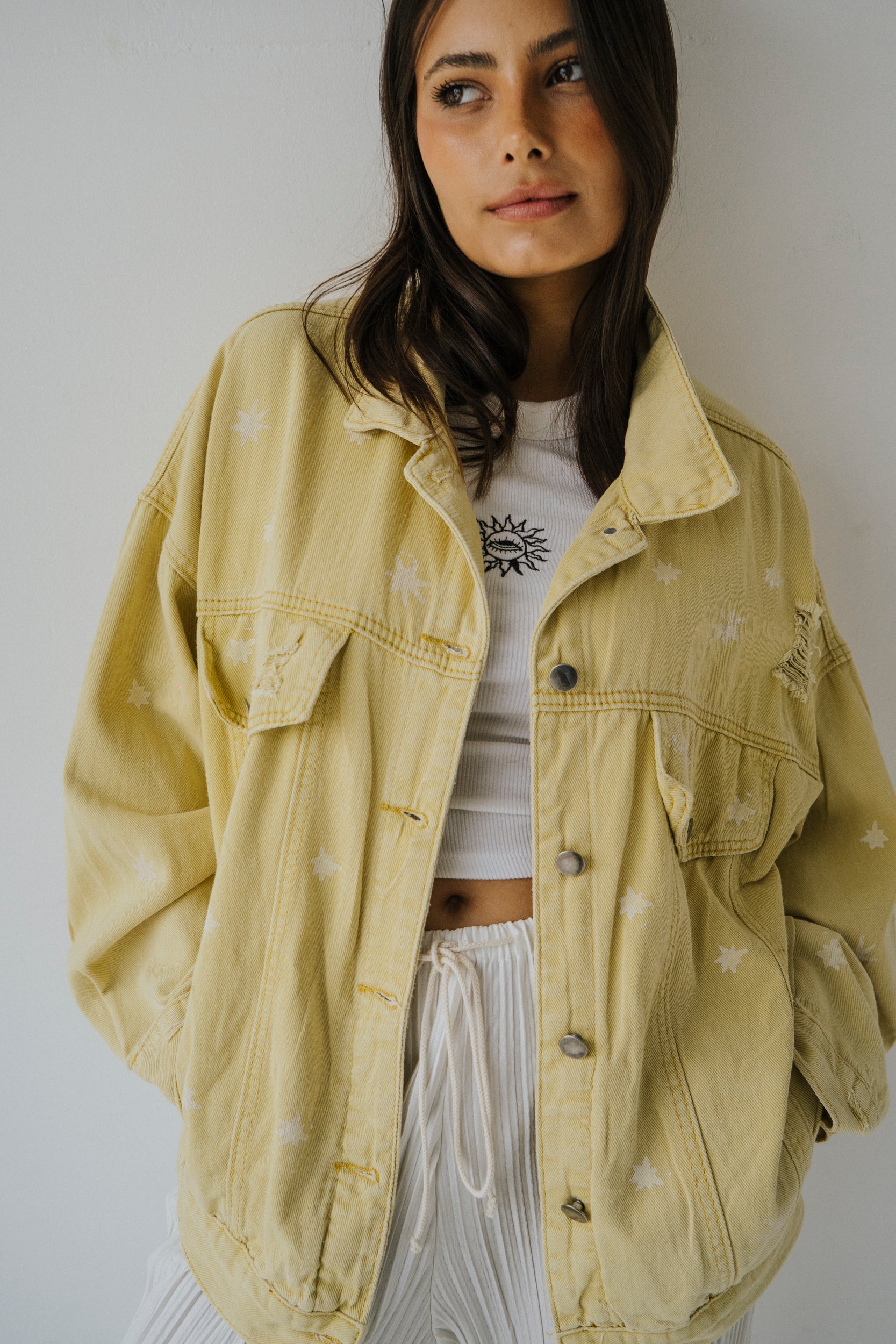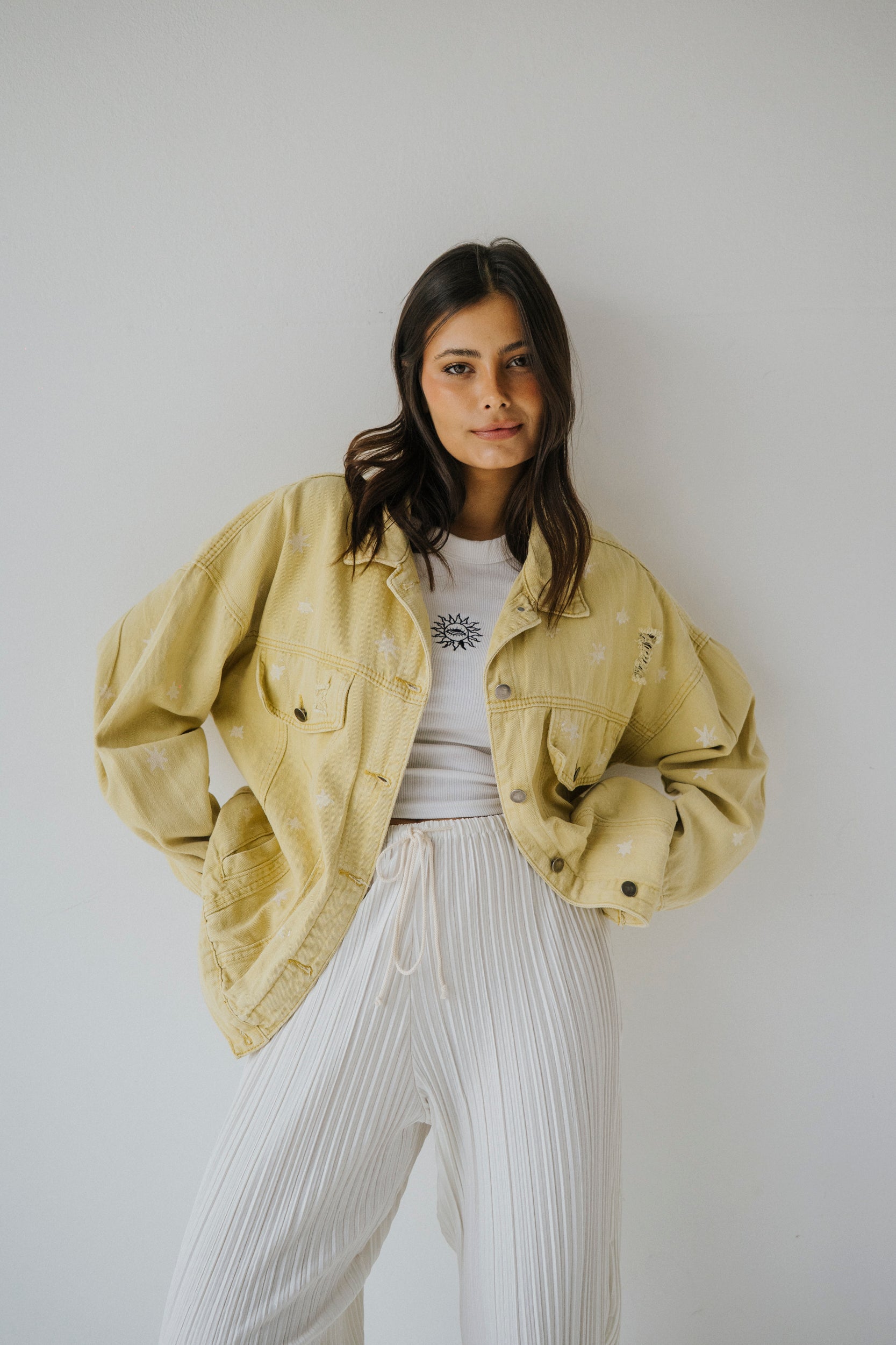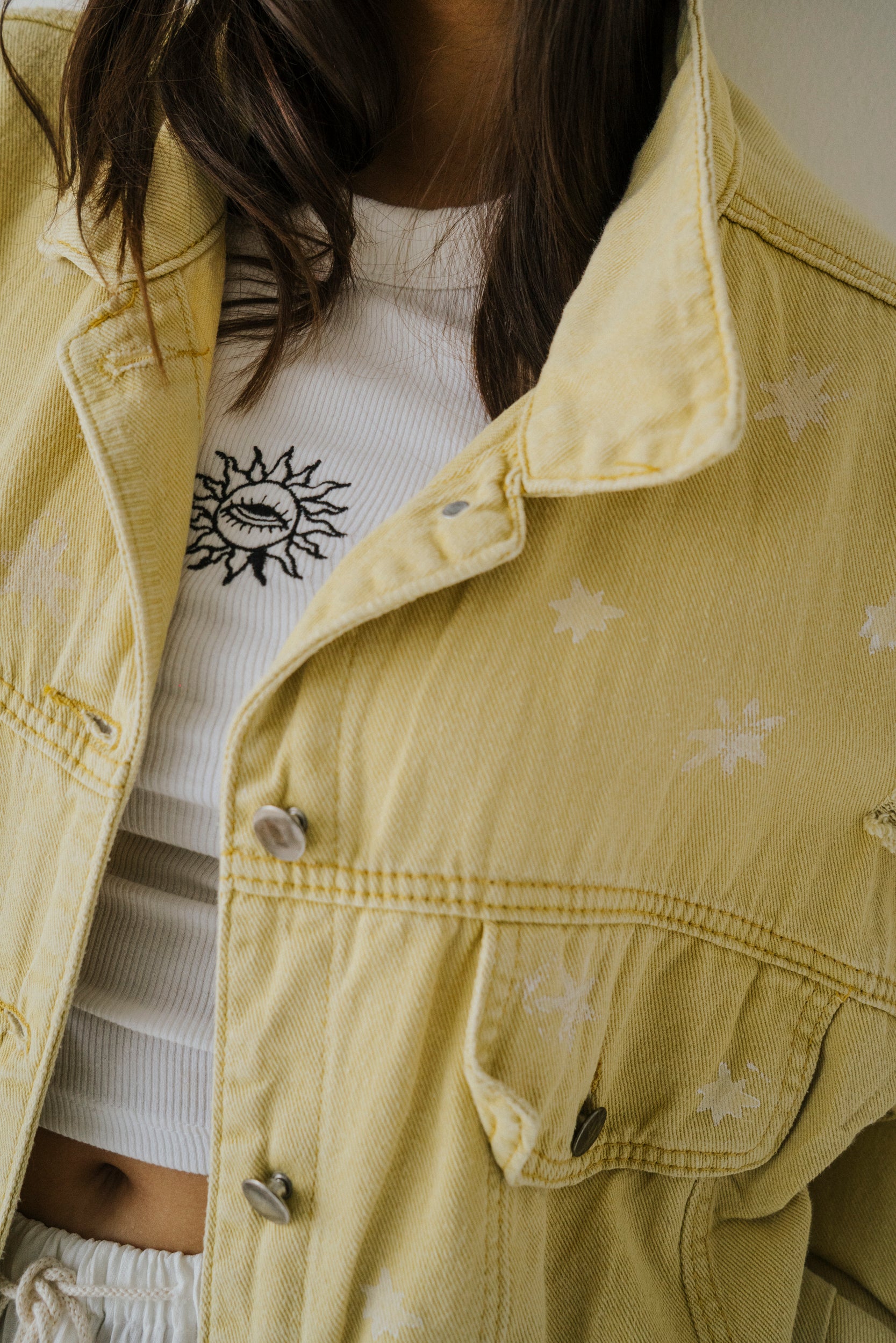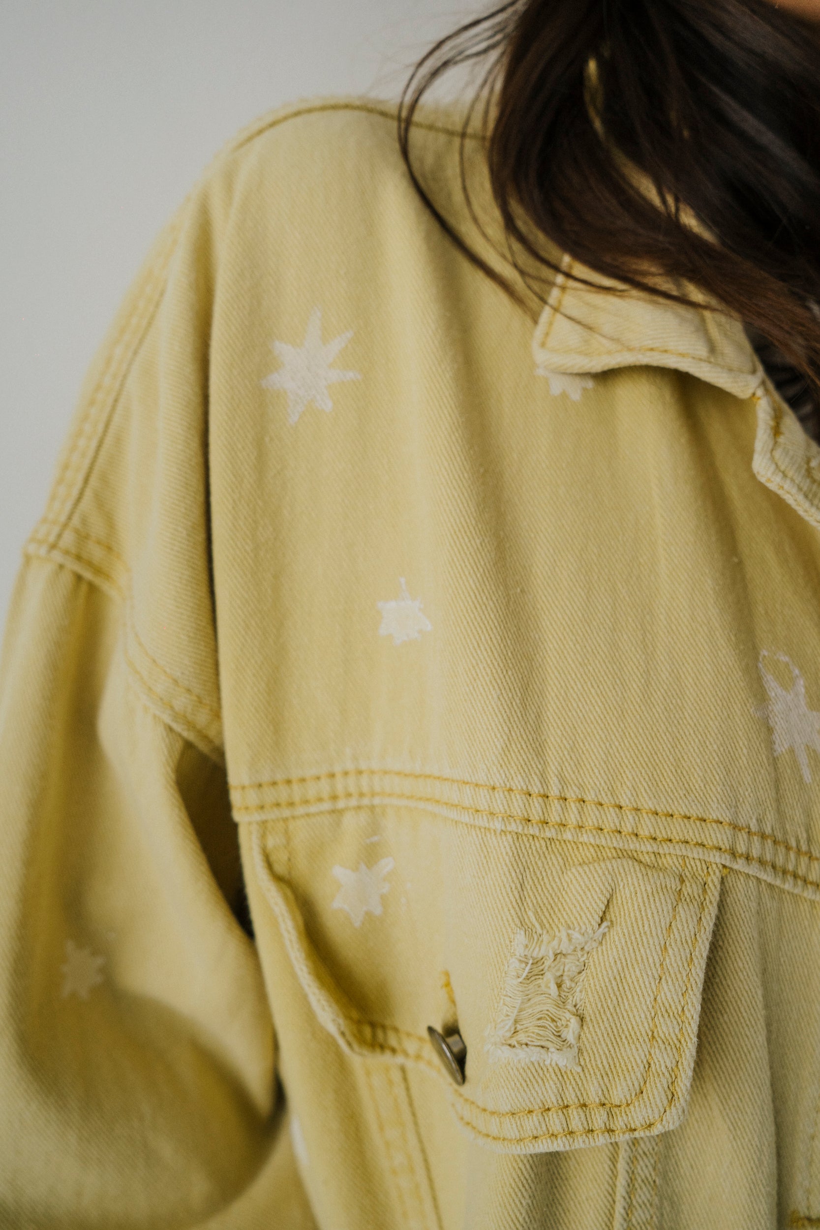 Casaco de ganga recuperado em segunda mão, personalizado à mão com carimbos e um bordado statement nas costas que transforma a peça por completo. Pode conter marcas de tinta.