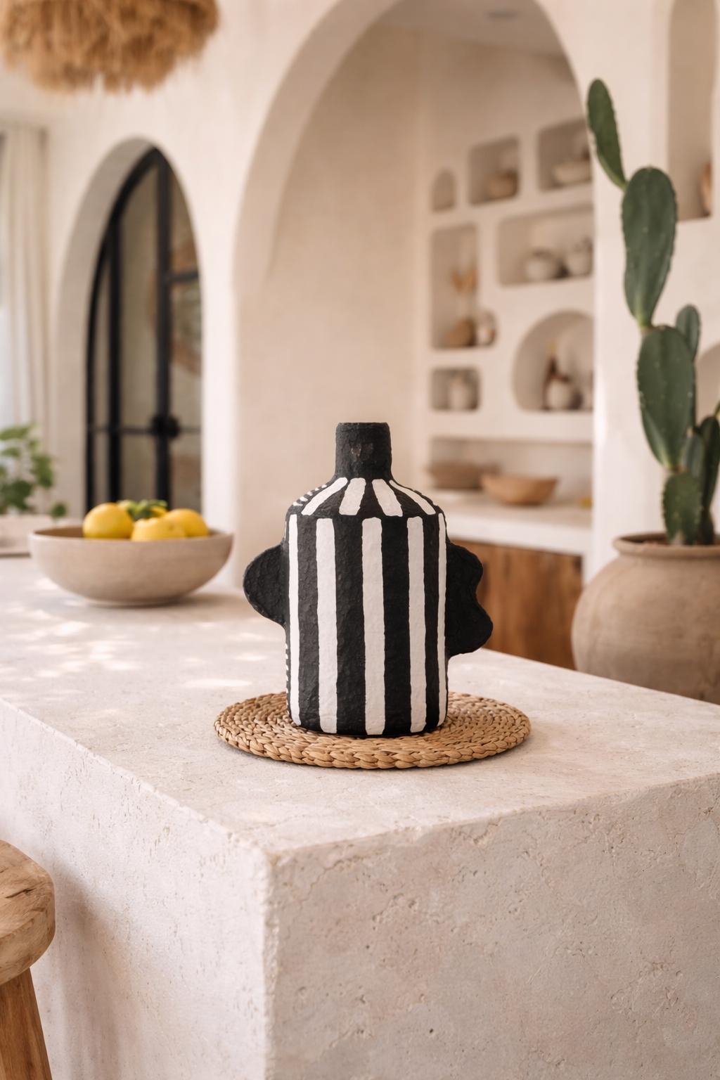 Jarra feita à mão a partir de uma garrafa de licor e papier mâché, pintada com tinta acrílica. Com pega irregulares.