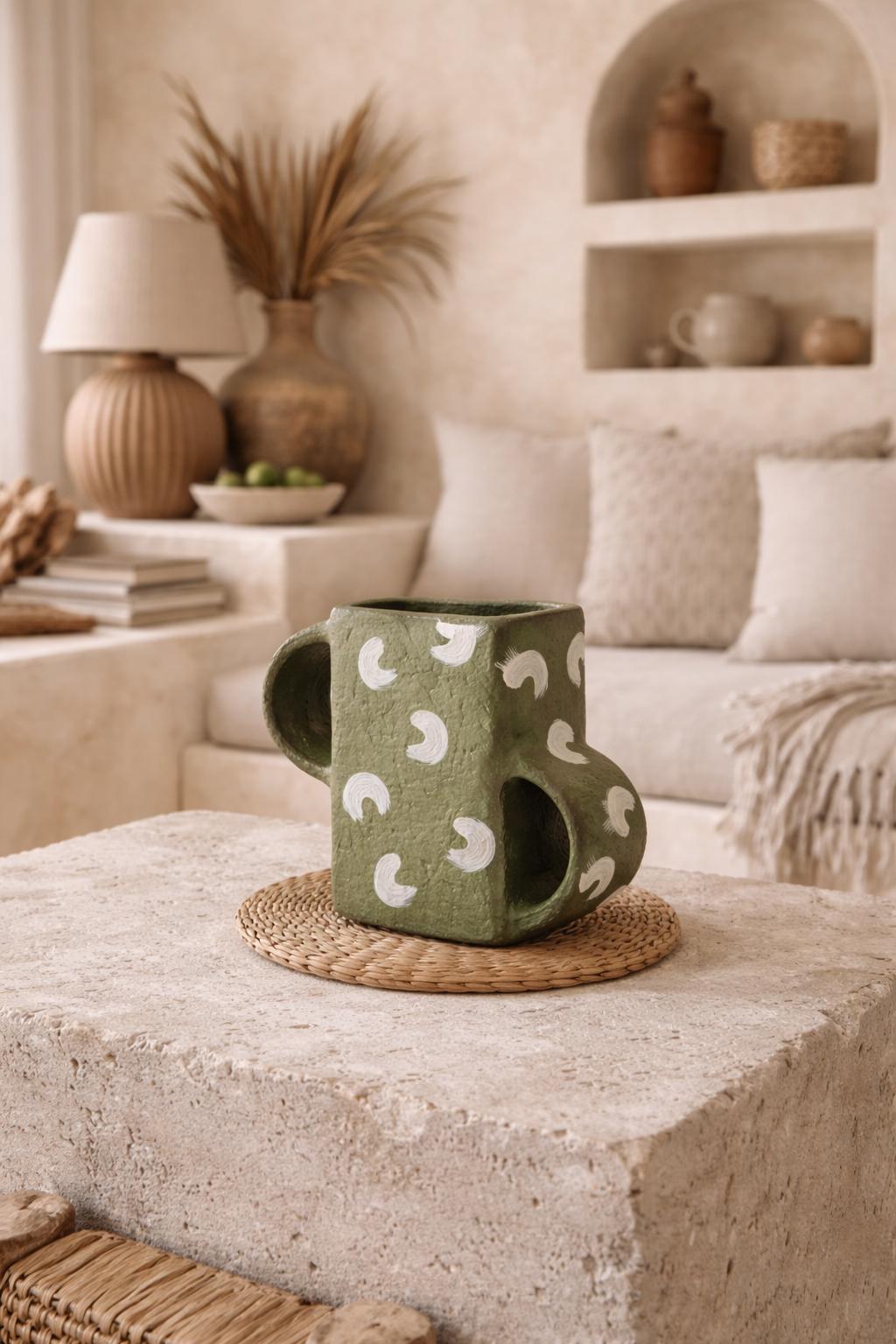 Jarra feita à mão a partir de um pacote de leite e papier mâché, pintada com tinta acrílica. Com pega e bolas coloridas.