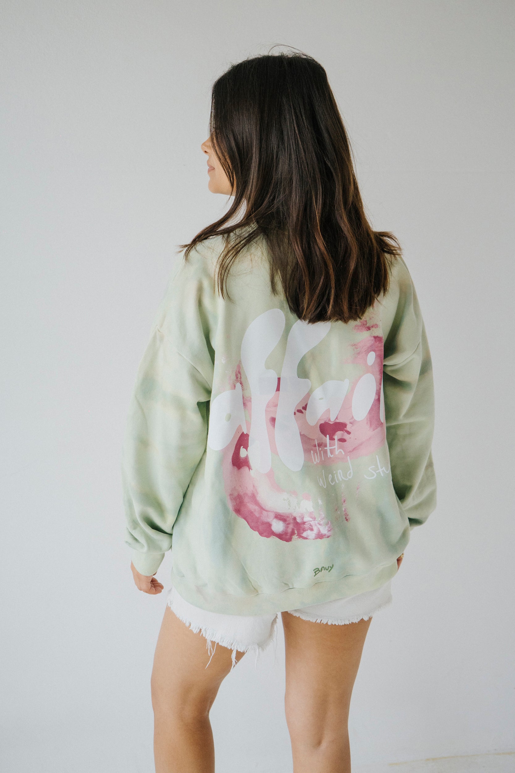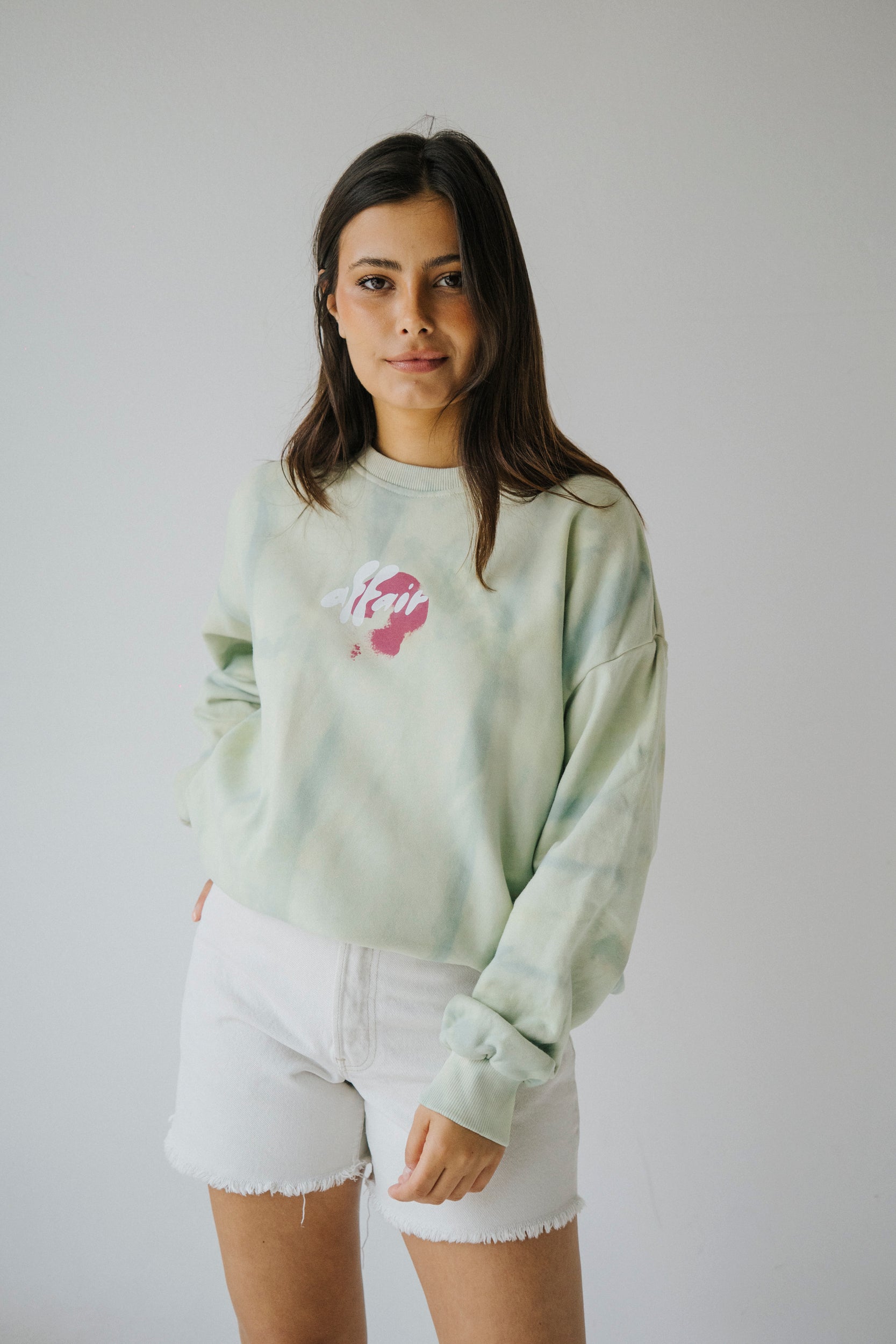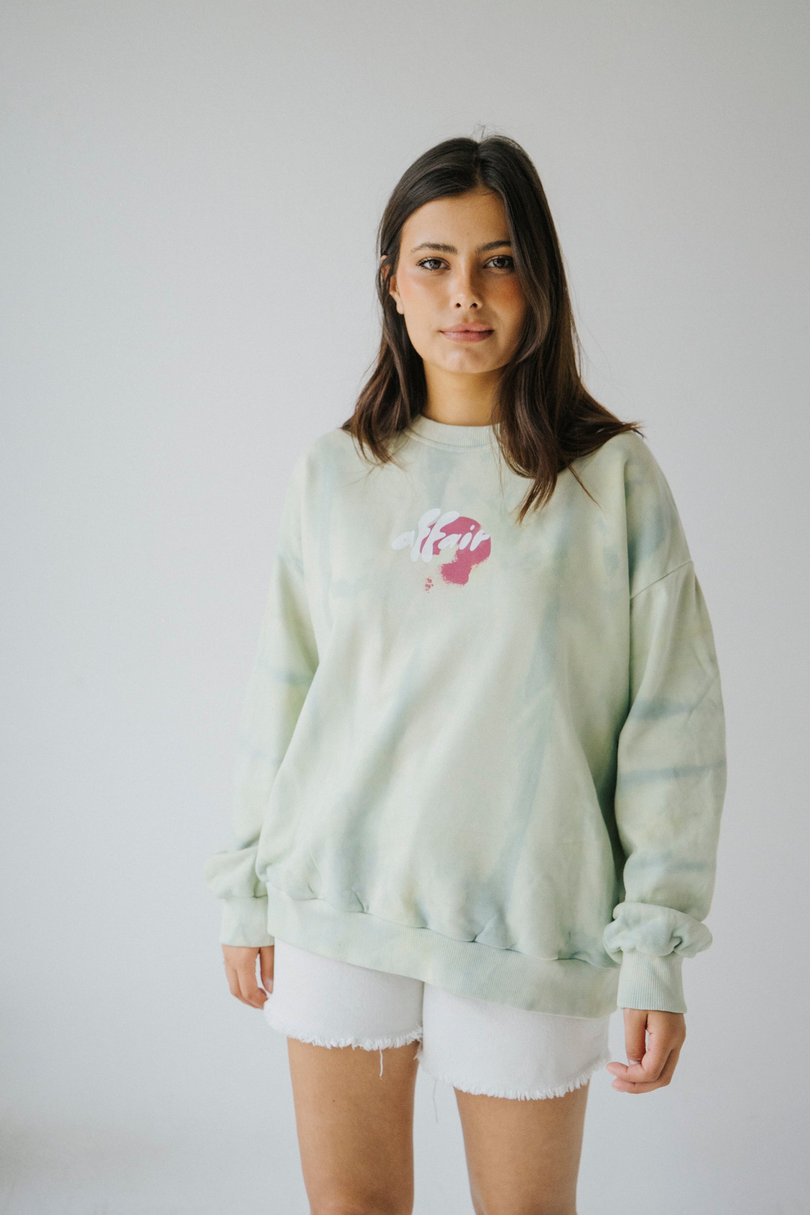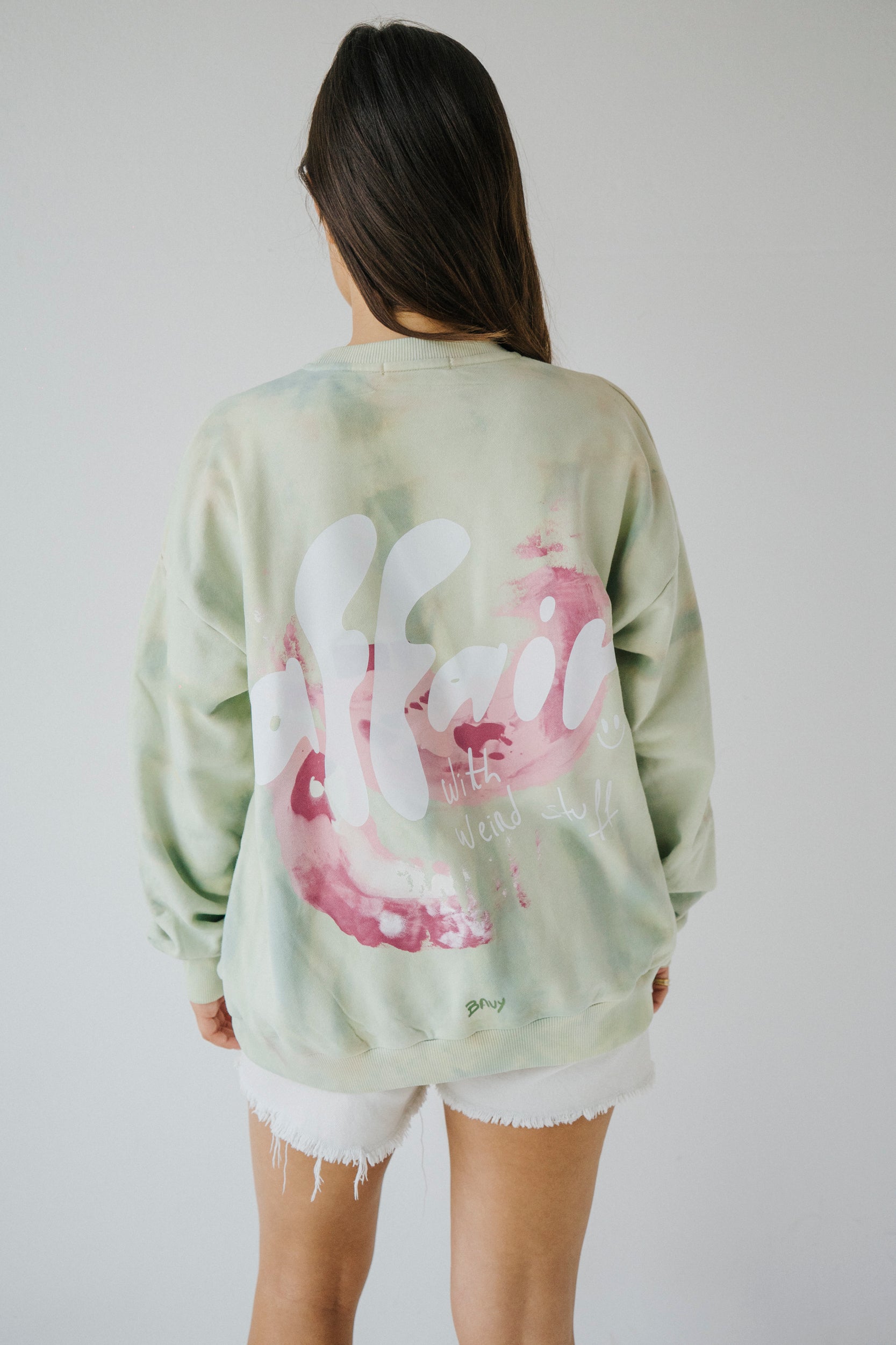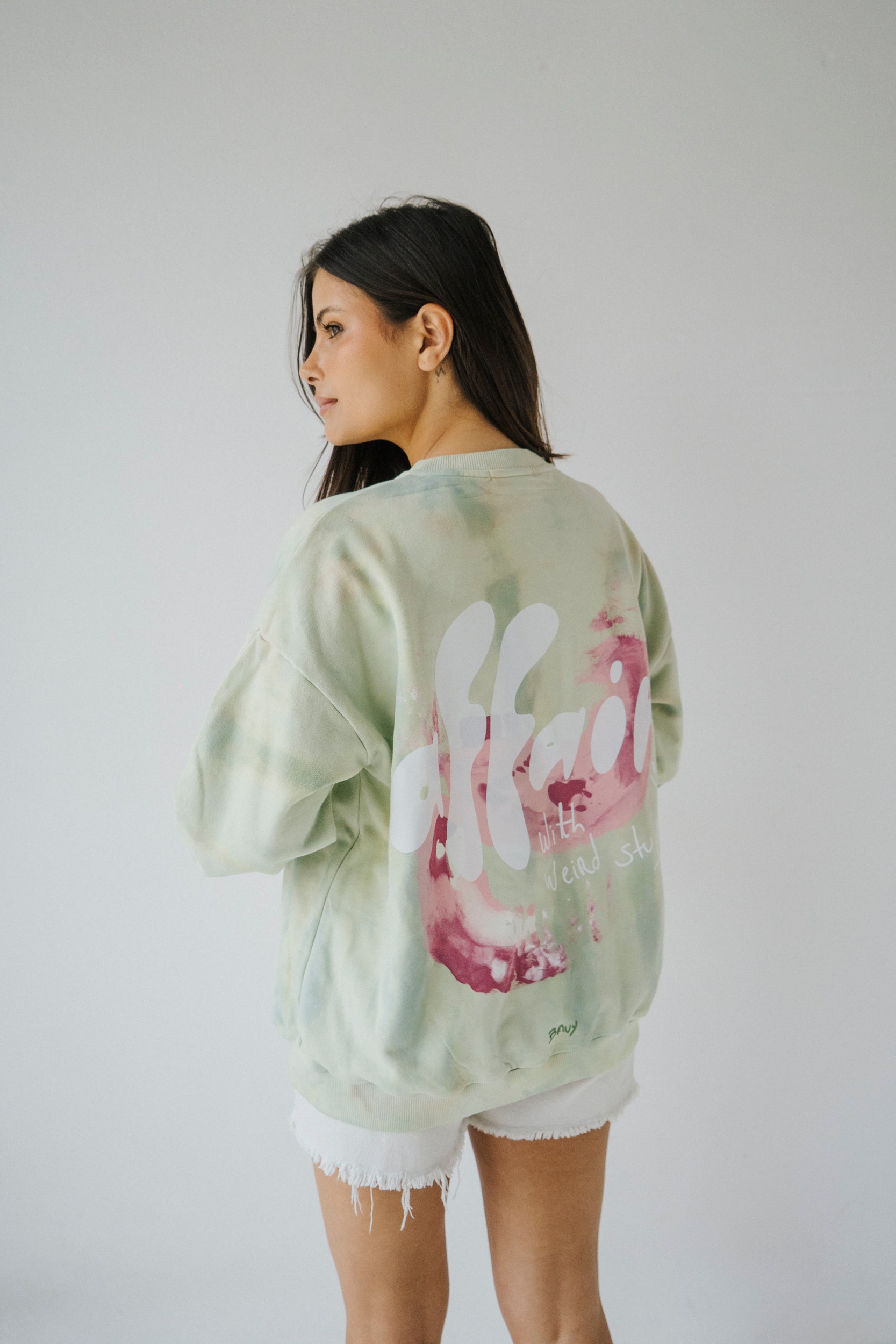Camisola de algodão tingida com efeito tie dye de forma artesanal. Com punhos, cinto e gola em rib. Estampada na frente e nas costas. Pintada à mão
