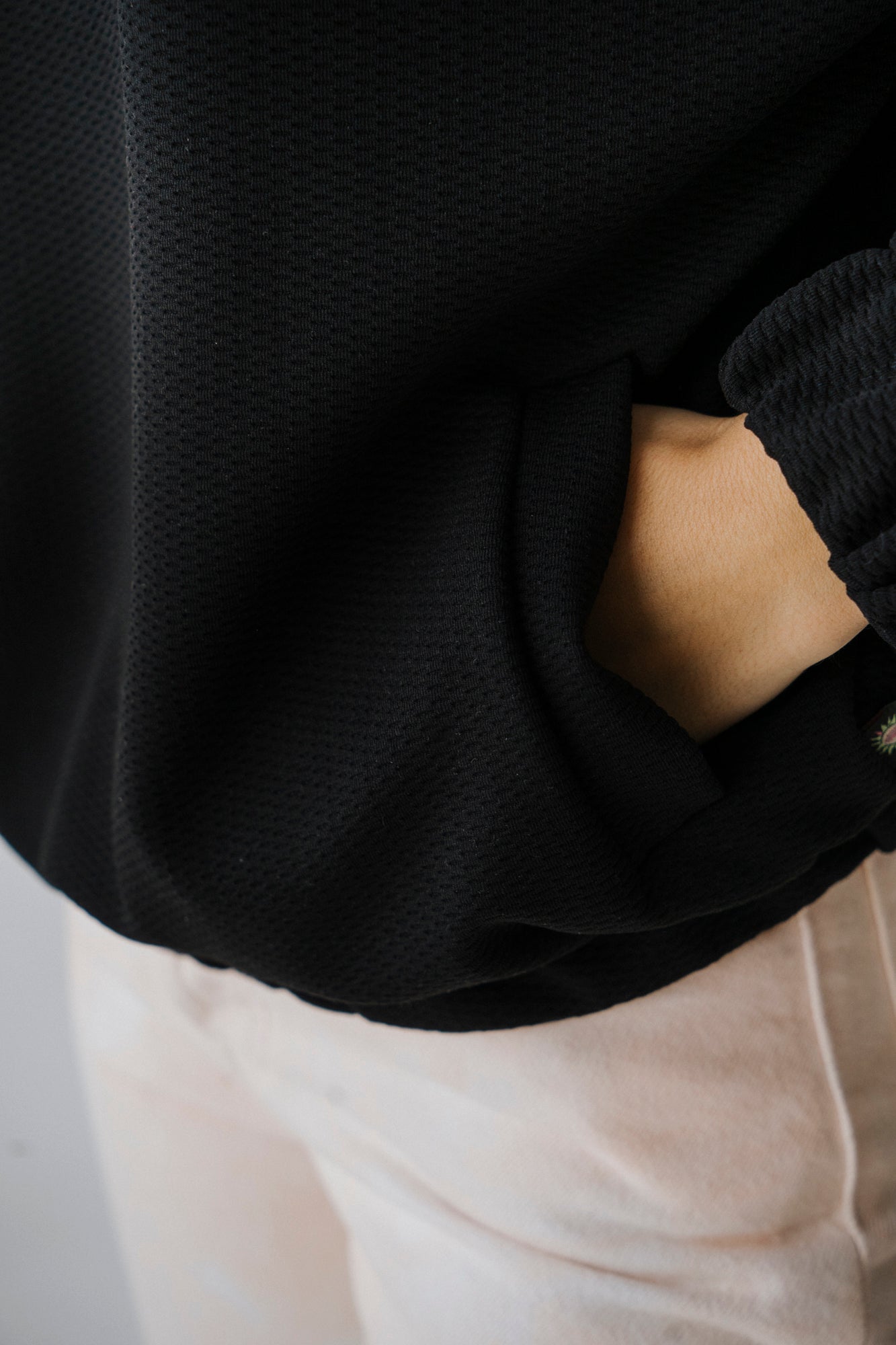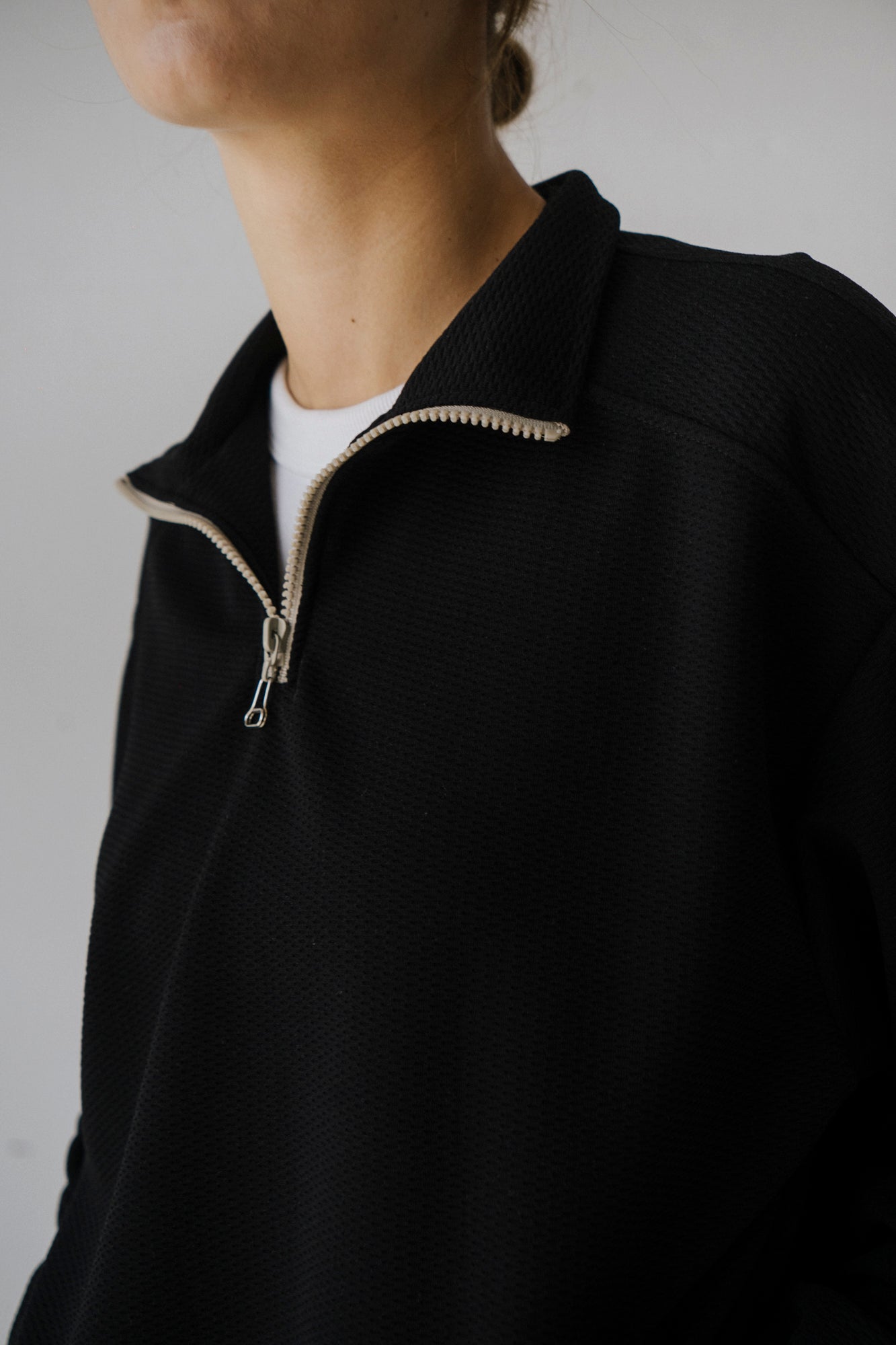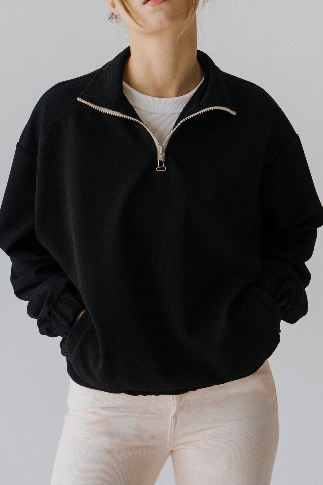 Camisola de poliester, estilo oversized, com fecho no pescoço, e bolsos. Elásticos na cintura e nos punhos forrados no mesmo tecido. Lavar a 30º.