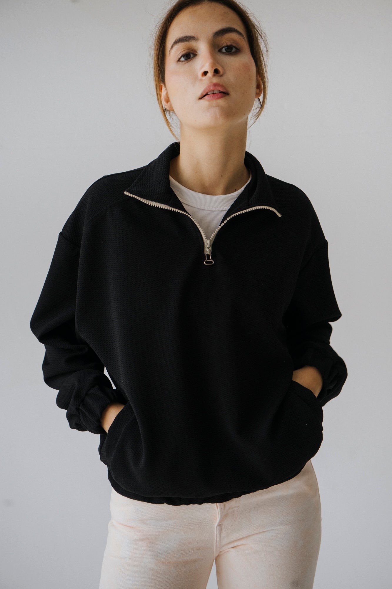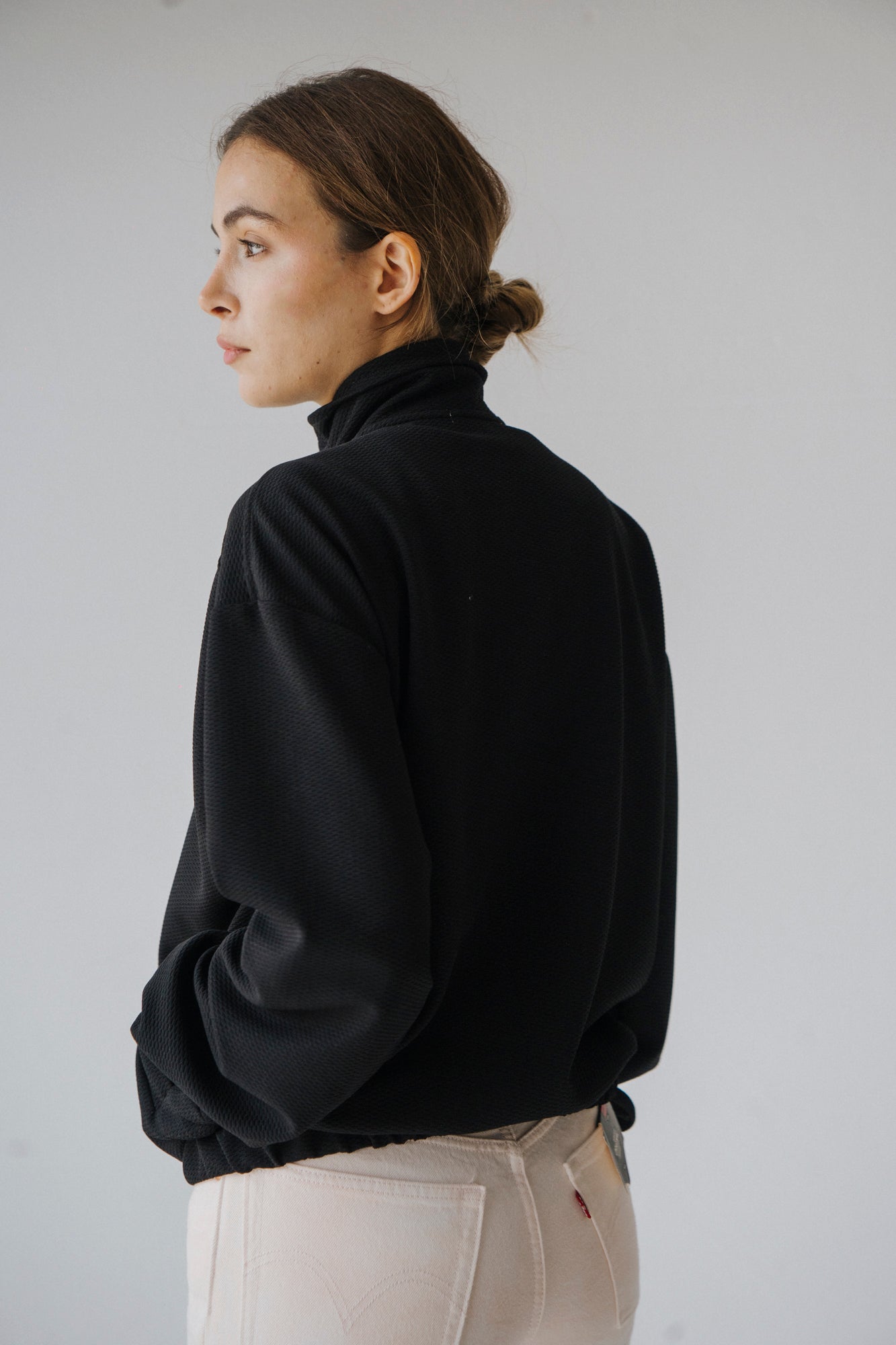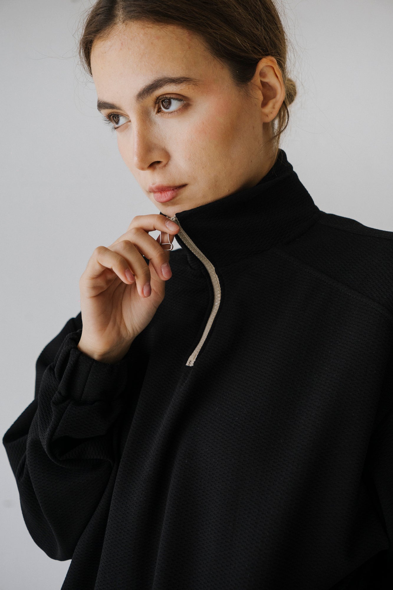 Camisola de poliester, estilo oversized, com fecho no pescoço, e bolsos. Elásticos na cintura e nos punhos forrados no mesmo tecido. Lavar a 30º.